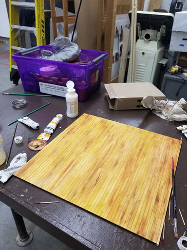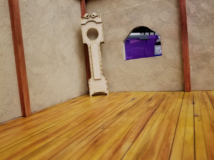 With the help from a laser cutter, all of the tools, furniture, and toys were cut and painted. The walls were constructed with foam core and sand paper for texture, using balsa wood for details. The staircase and window are inlaid into the wall. A watch face and pop rivet were added to create the bench vice and clock face. Watch the miniature come to life with every added detail and coat of paint.